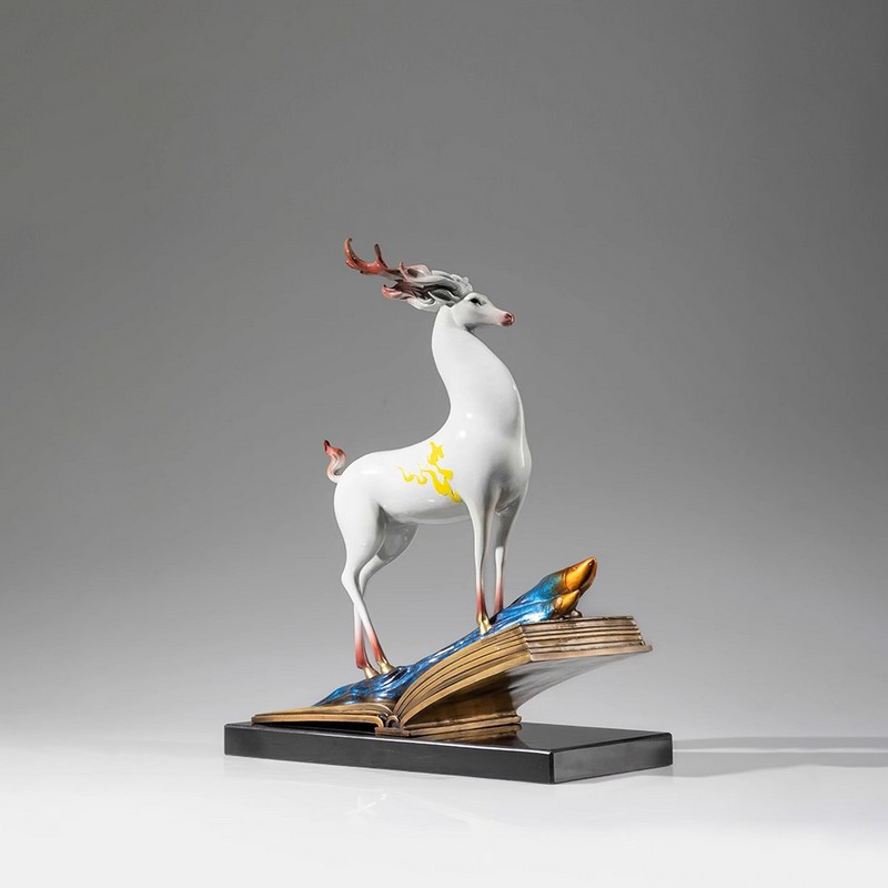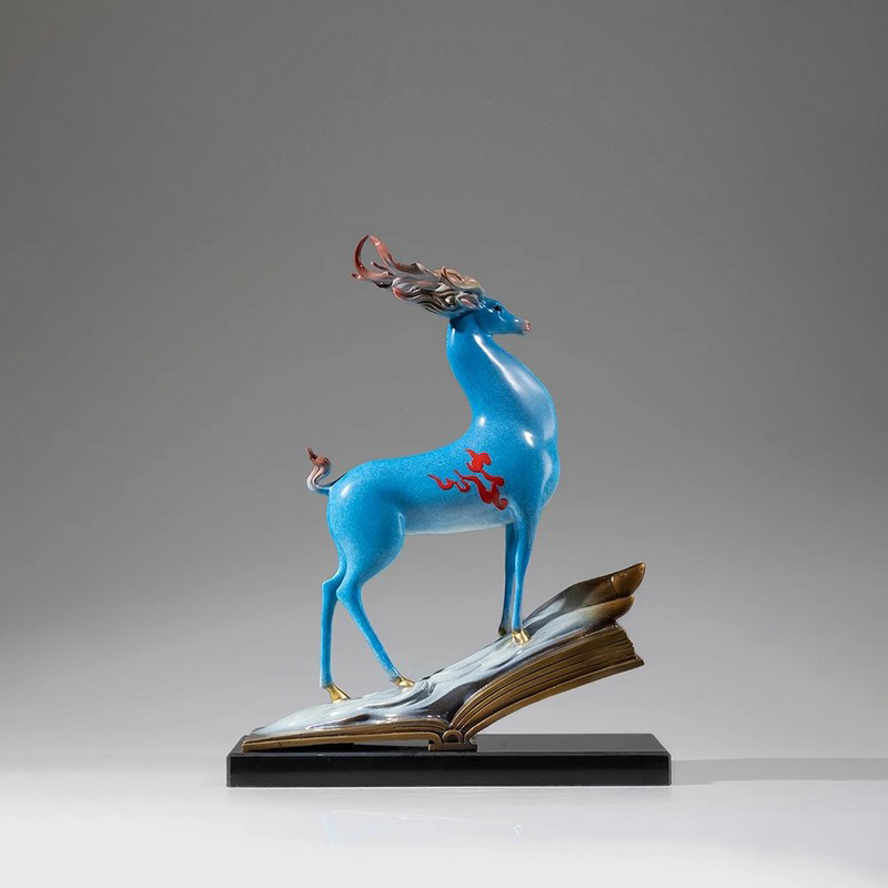 In the sculpture's design, the deer stands proudly atop the book, symbolizing the union of wisdom and strength. The painting technique gives the deer's body vivid colors. The white symbolizes purity and the blue conveys tranquility, which contrasts with the golden books, making the overall effect of Chinese style deer sculpture harmonious. Placed in a home or study, it brings a sense of art and culture, enriching the space. While some may associate the Doe Deer Sculpture with this type of work, this statue further emphasizes the fusion of scholarly atmosphere and artistic beauty.