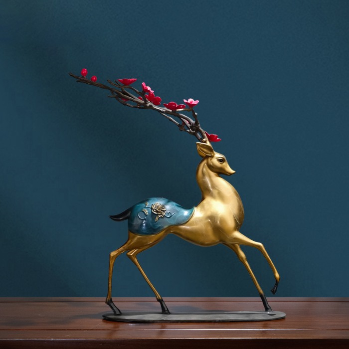 This sculpture cleverly combines the soft sheen of the gold deer's body with the striking contrast of red antlers and flowers, presenting an elegant yet vibrant visual effect. The light and airy form of the gold reindeer figurine seems to be moving towards the light, bringing positive and warm energy to the space. It is perfect for placing on a living room low cabinet, entryway countertop, or as a dining table decoration during the holidays. In many homes, Bronze Reindeer Sculpture is often used to create an atmosphere, making the home more stylish and ceremonial.