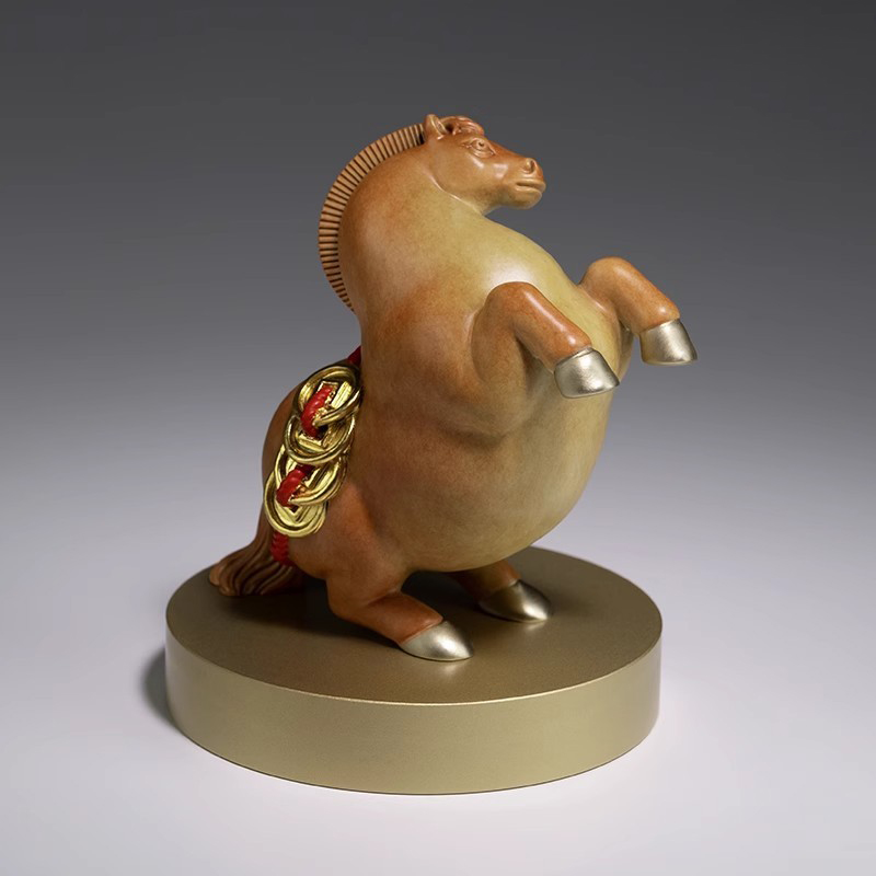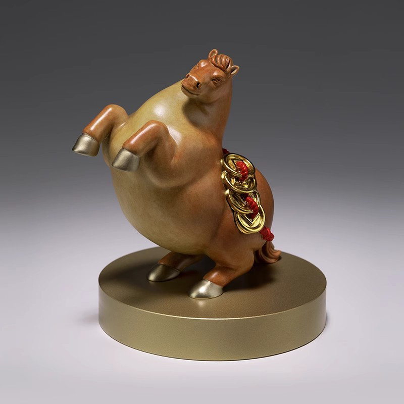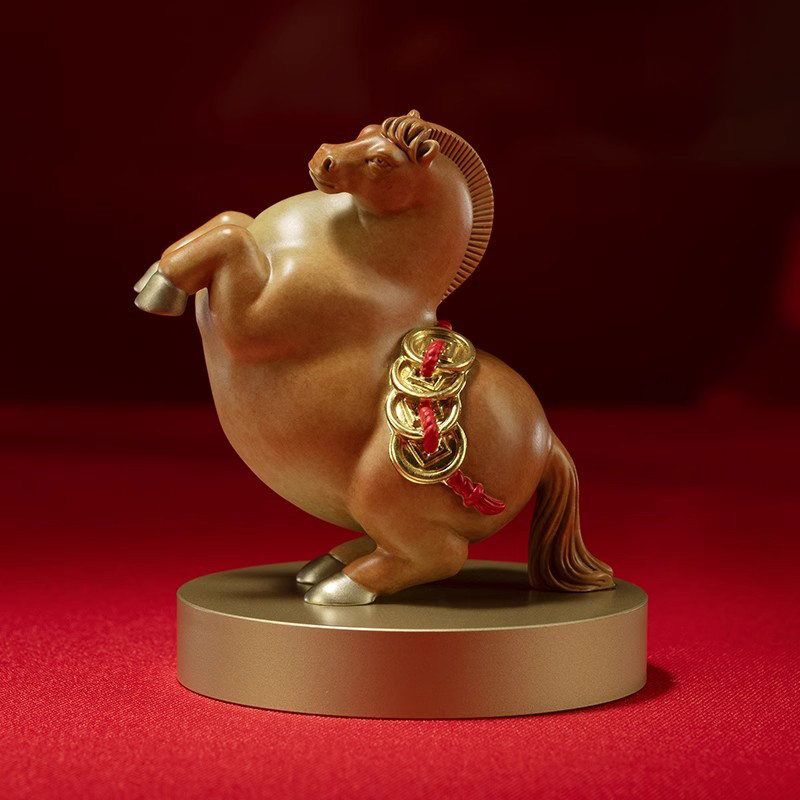 In everyday life, this sculpture is not only a lovely decorative work of art, but also carries the symbolic meaning of good luck and wealth. The pony's rounded shape symbolizes abundance and good fortune, while its raised hoof represents positive energy. Crafted from bronze, this fat horse sculpture boasts exquisite craftsmanship, a rich, durable texture. Embellished with gold coins and red string, it adds a festive touch. Whether displayed in the home or office, it fosters a positive and peaceful environment. This sculpture, known as the "Fat Horse Sculpture," emphasizes both its unique artistic style and its symbolic meaning of auspiciousness and prosperity.