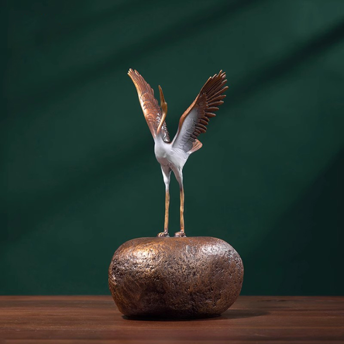 The sculpture perfectly combines the elegant posture of the crane with the texture of brass, presenting an artistic effect that is both light and stable. The outstretched wings symbolize hope, striving, and good fortune, making it ideal for placement in the living room, entryway, or office, bringing tranquility and style to the environment. The brass crane sculpture features richly layered wings and a stable base, as if freezing a fleeting moment of natural dynamism into space. Crane Yard Ornaments are frequently chosen for garden and home furnishings.