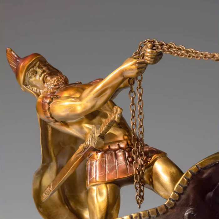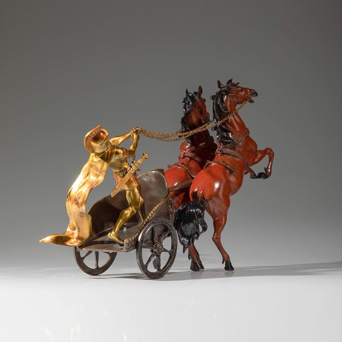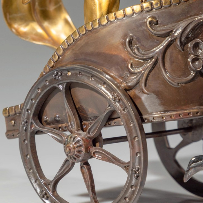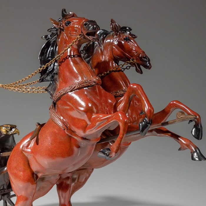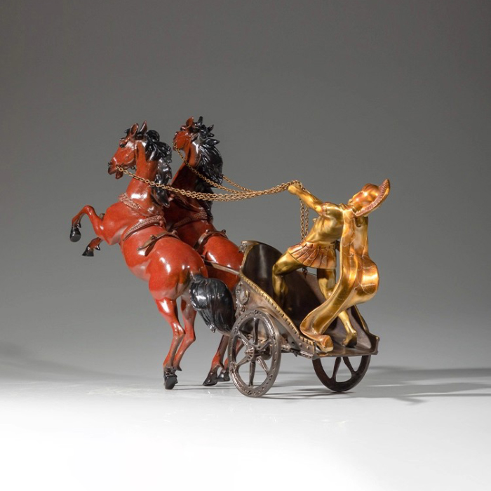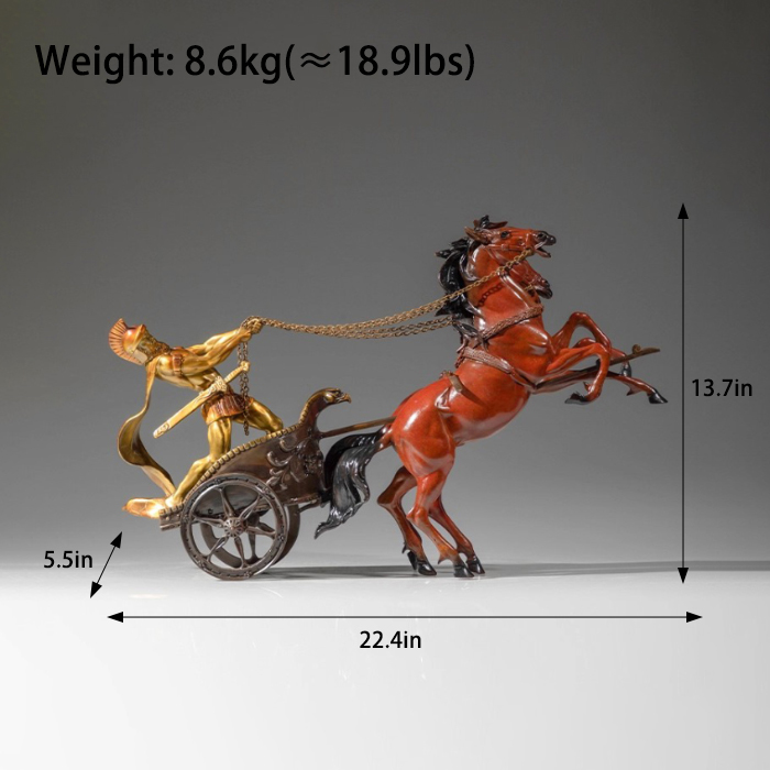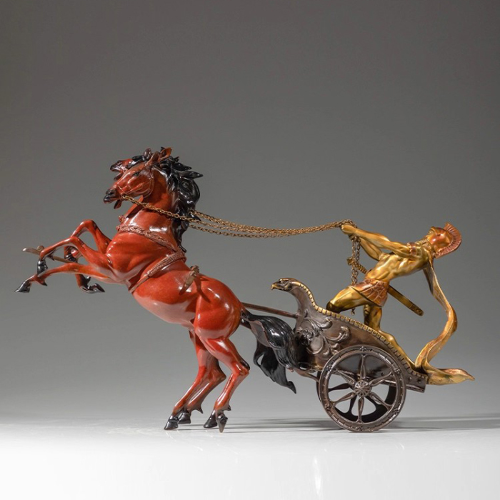 This type of bronze chariot statue is characterized by its complex composite design, unifying figures, horses, and vehicles into a single cohesive form that demands precise proportions and skilled craftsmanship. Chariot sculpture often functions as a visual focal point in interior displays, effectively anchoring key areas and adding depth to spatial arrangement. The multi-element structure of Chariot Sculpture gives it a strong presence in decorative settings, making it suitable for standalone display or coordination with other bronze works.