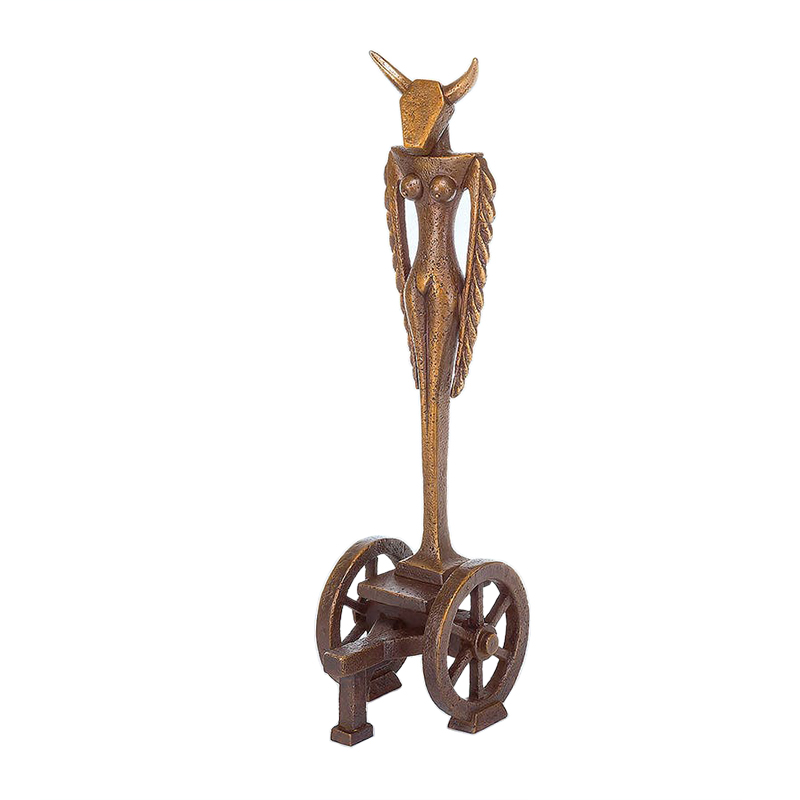 This is an abstract bull sculpture. The artist described the cow as a god with a cow head and a human body, standing on a chariot.